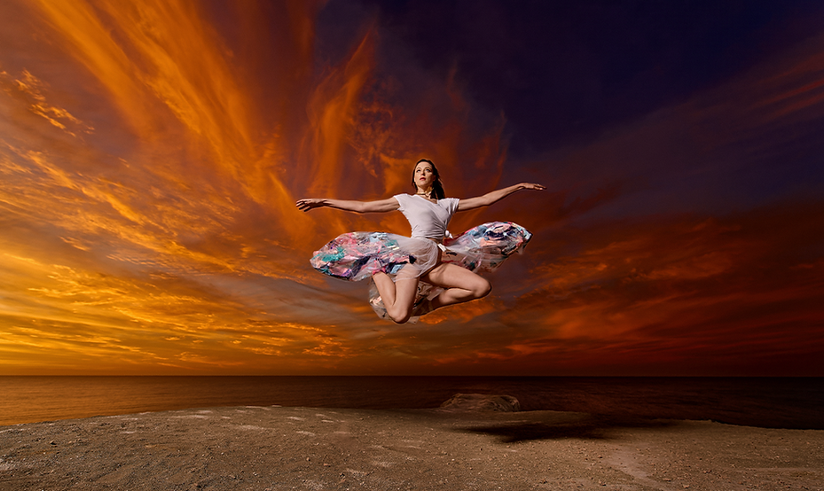 當太陽接近地平線時,天空變成火焰般的橙色,天然光線在每秒鐘也在改變,而我們只剩幾分鐘的拍攝時間。Erin穿著足尖鞋,不斷變換姿勢,而Siros 800 L全程表現出色。最後一張照片中,Erin跳躍至空中,背景的雲彩和光線都恰到好處,我們亦把握最後的拍攝機會。