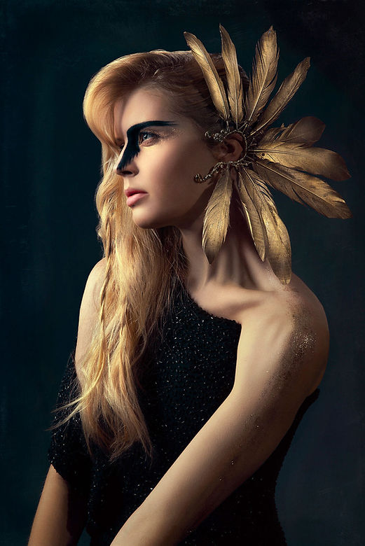 為了讓模特兒能夠從背景中稍微突顯出來,我加裝了一盞帶有蜂巢格的條形柔光箱,放在相機右側,朝著模特兒的肩膀與背部打光。我不希望背光太強烈地打在她的頭髮或頭飾上,所以在柔光箱前方再加了一塊ND遮光板,讓光線只集中打在肩膀上,而不是整個身體。最後,我還加了一支裸燈頭的 broncolor Siros 800L,以非常低的輸出功率,直射頭飾,為它增添一些光澤與亮點。